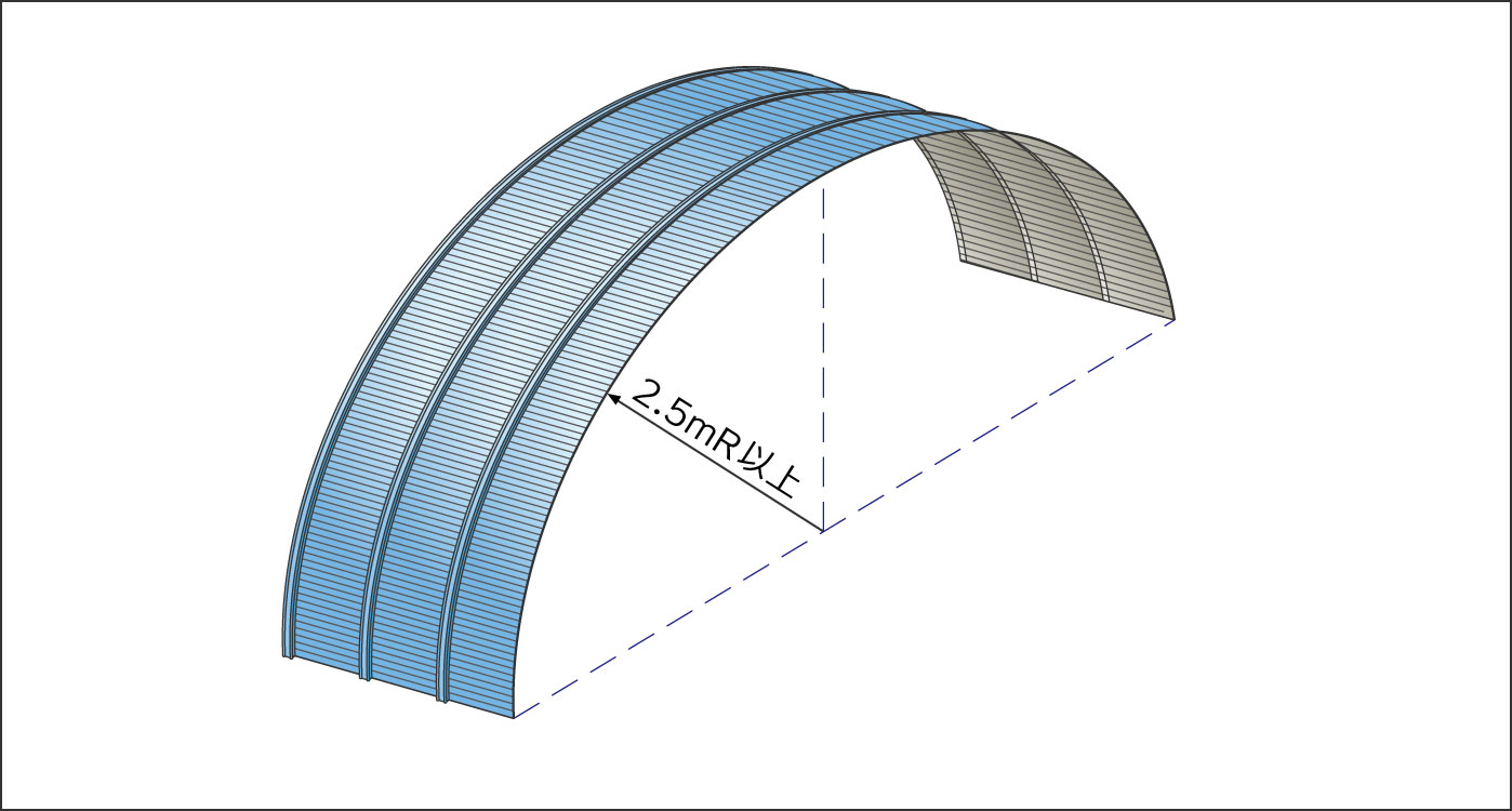 ●シンプルな形状が、和風建築、洋風建築等、あらゆる建物にマッチする美しいアーチ屋根です。●最小曲げ半径R=2.5m以上のアーチ屋根が可能です。